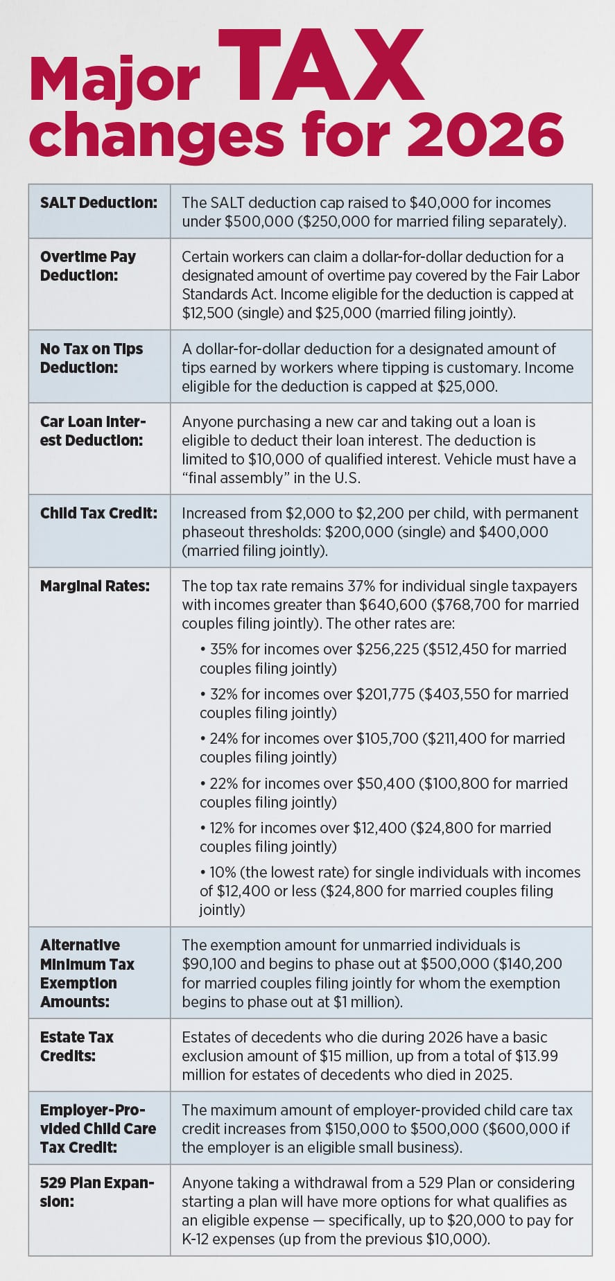 The strategic play: if you’ve been deferring property tax payments or state estimated tax payments, 2026 might be the year to prepay. Bunch multiple years of deductible state taxes into one federal year to maximize itemized deductions.